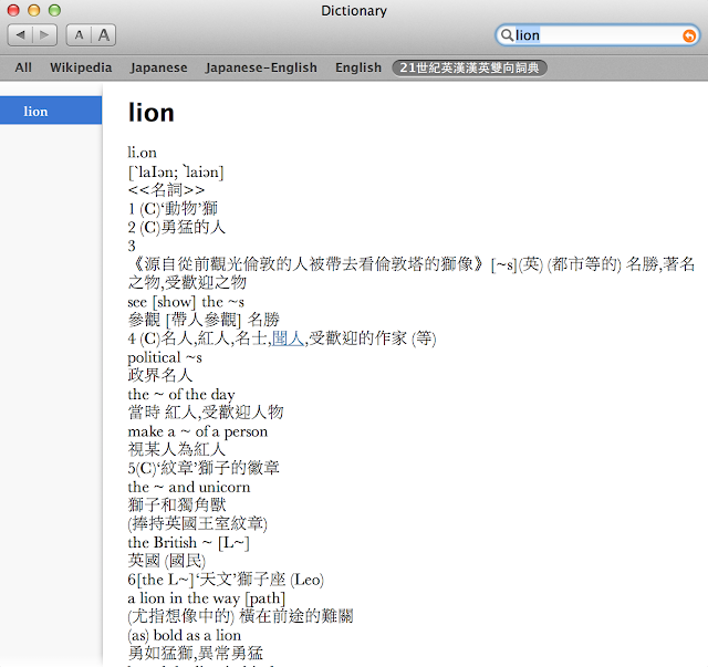 另外可以安裝 "21世紀英漢漢英字典", 可以從以下鏈結下載, 可用在 Mac OS Lion
