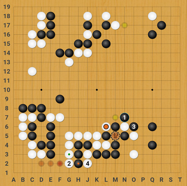 4. 第 104 手 白 直接 K15 碰上來, 一路到 129 手, 感覺白棋攻勢凌厲, 有點擋不大住,